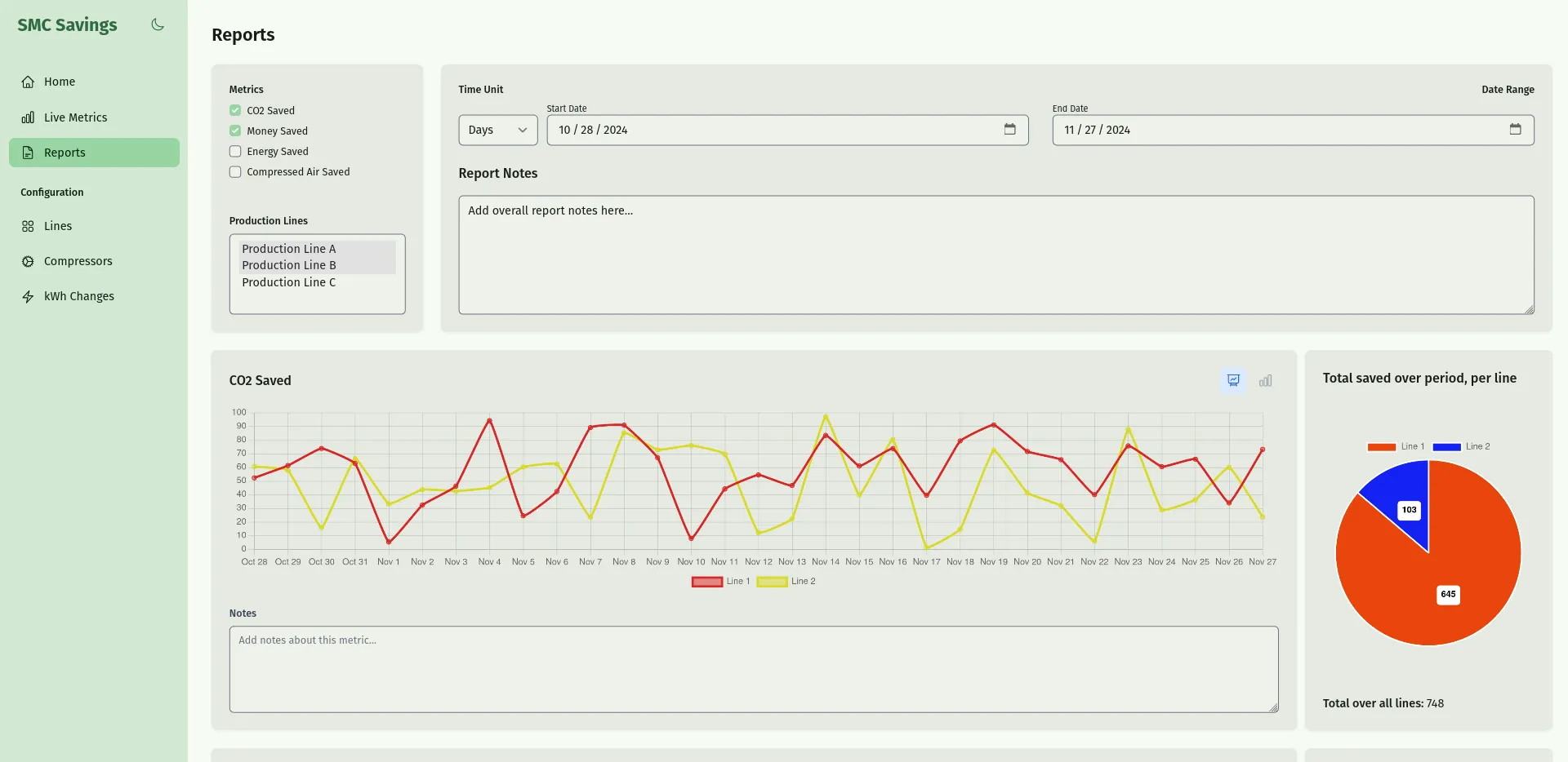 The main page provides an overview of the savings trends, where different machines may be under the same “Line”. Users can drill down into specific metrics and period, and build a report from them:
